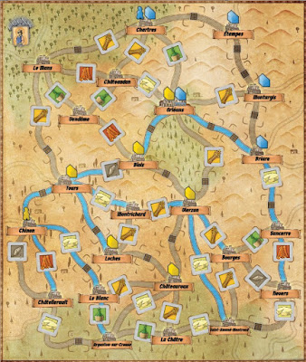 One aspect of the game is a map showing towns around Orleans. You have a pawn on the map and you can travel about to claim goods and to build trading posts. Goods are worth points at game end, and trading posts too.